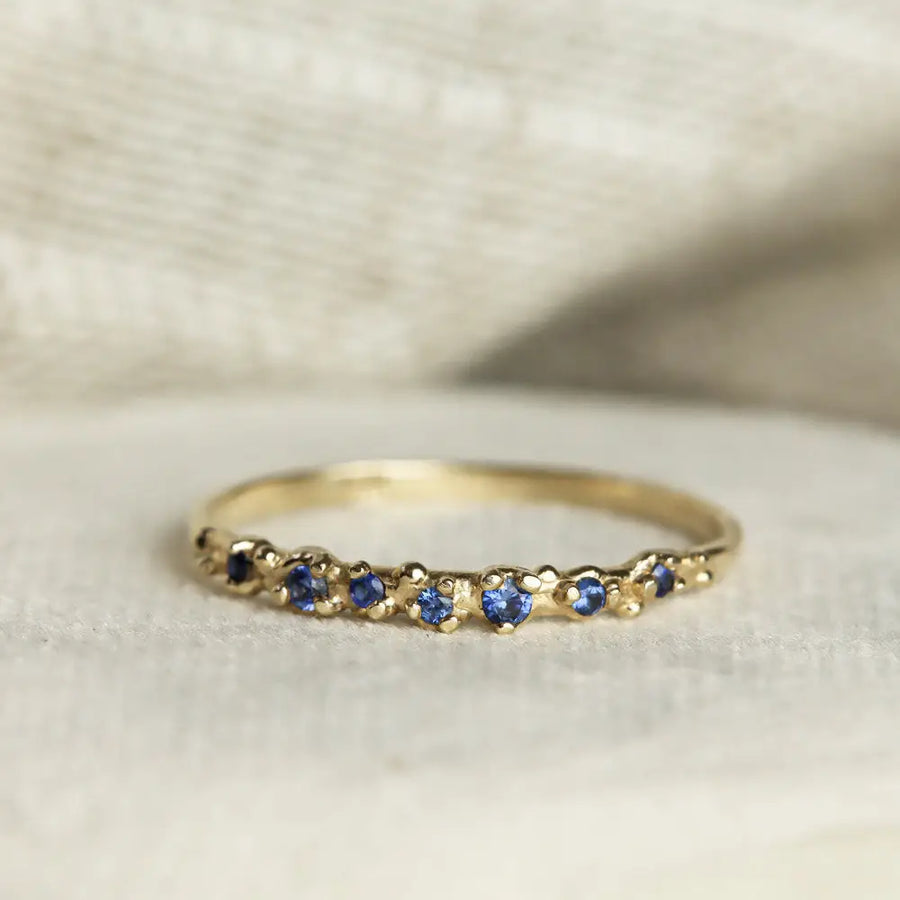 This gorgeous hand-sculpted ring features 7 sparkling blue sapphires set with the daintiest of prongs in an ocean inspired texture. Delicate and comfortable to wear, this solid gold sapphire ring would make the perfect feminine, oceanic wedding band or everyday ring to add to your stack! 14 Karat Solid Gold Band. Responsibly sourced, natural diamonds (.08 total carat weight) - Widest point at the top is approx 1.8mm, bottom of the band is 1.5mm - Finish: polished.