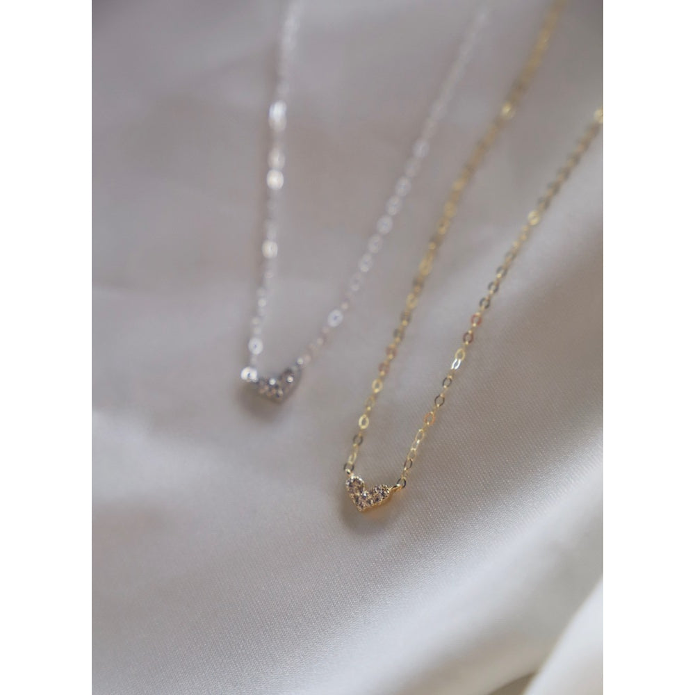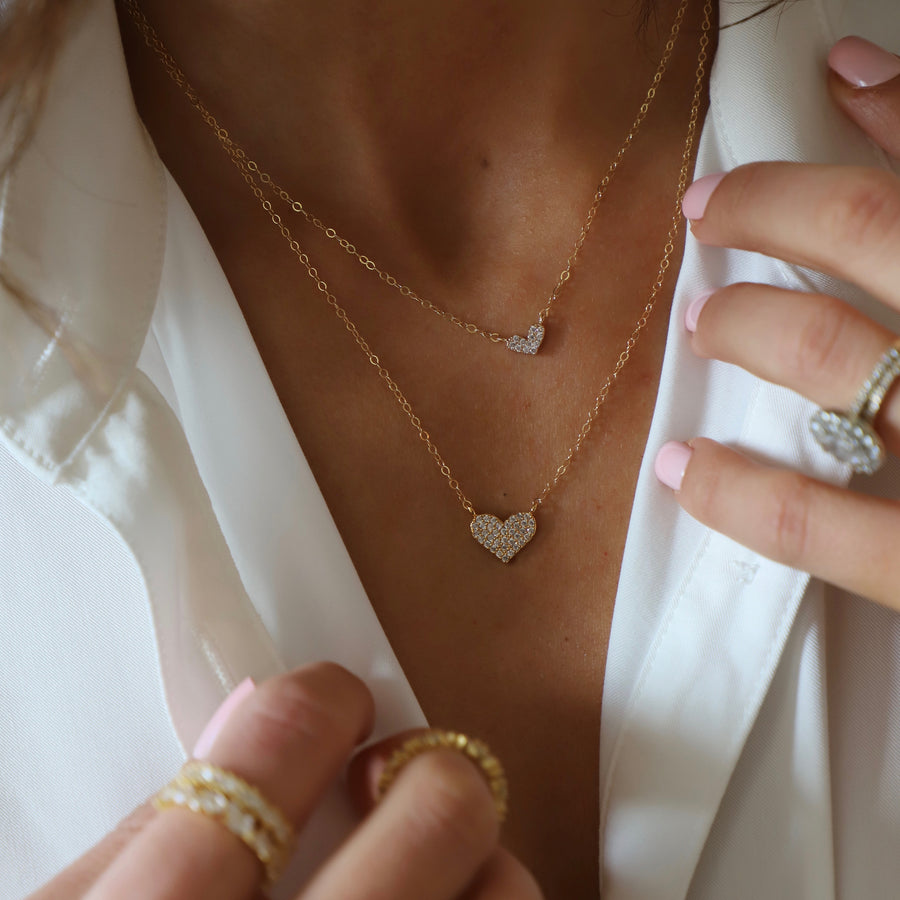 Our CZ Floating Mini Heart Necklace is the perfect gift for your loved ones year round. It's a great addition for layering with a thicker chain or leaving it to shine on its own! For maximum cuteness, pair the two hearts together. *Sold separately Materials: Gold filled chain, gold plate over brass Size: Miniature: 16" chain, 9.5mm x 6mm charm Made in United States of America.